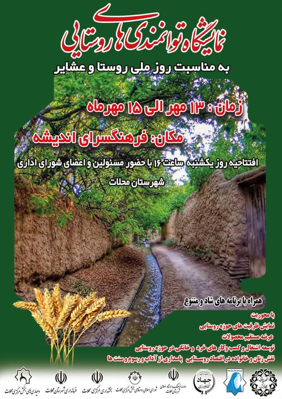 بمناسبت روز ملی روستا و عشایر در نمایشگاه توانمندی های روستایی شهرستان محلات با حضور مدیرکل دفتر امور روستایی و شوراهای استانداری مرکزی،فرماندار شهرستان، معاونین فرماندار،بخشدار مرکزی ، شهردار محلات و جمعی از مسئولین در فرهنگسرای اندیشه شهرداری محلات افتتاح شد.